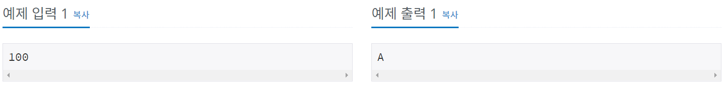 import java.util.Scanner; /** * 시험 점수를 입력받아 90 ~ 100점은 A, 80 ~ 89점은 B, 70 ~ 79점은 C, 60 ~ 69점은 D, 나머지 점수는 F를 출력하는 프로그램을 작성하시오. * @author imj10 * */ public class TestScores_9498 { public static void main(String[] args) { Scanner scan = new Scanner(System.in); int A = scan.nextInt(); if(A>=90) { System.out.println("A"); } else if(A>=80) { System.out.println("B"); } else if(A>=70){ System.out.println("C"); } else if(A>=60) { System.out.println("D"); } else { System.out.println("F"); } } }- 결과