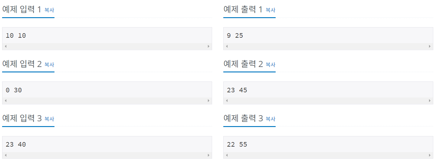 현재 상근이가 설정한 알람 시각이 주어졌을 때, 창영이의 방법을 사용한다면, 이를 언제로 고쳐야 하는지 구하는 프로그램을 작성하시오.