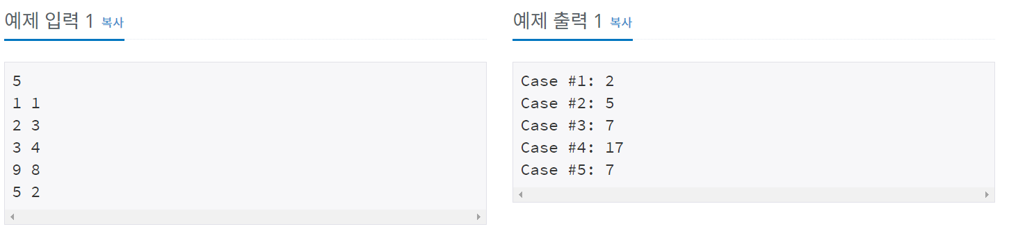 각 테스트 케이스마다 "Case #x: "를 출력한 다음, A+B를 출력한다. 테스트 케이스 번호는 1부터 시작한다.