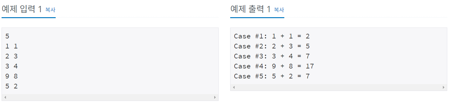 각 테스트 케이스마다 "Case #x: A + B = C" 형식으로 출력한다. x는 테스트 케이스 번호이고 1부터 시작하며, C는 A+B이다.