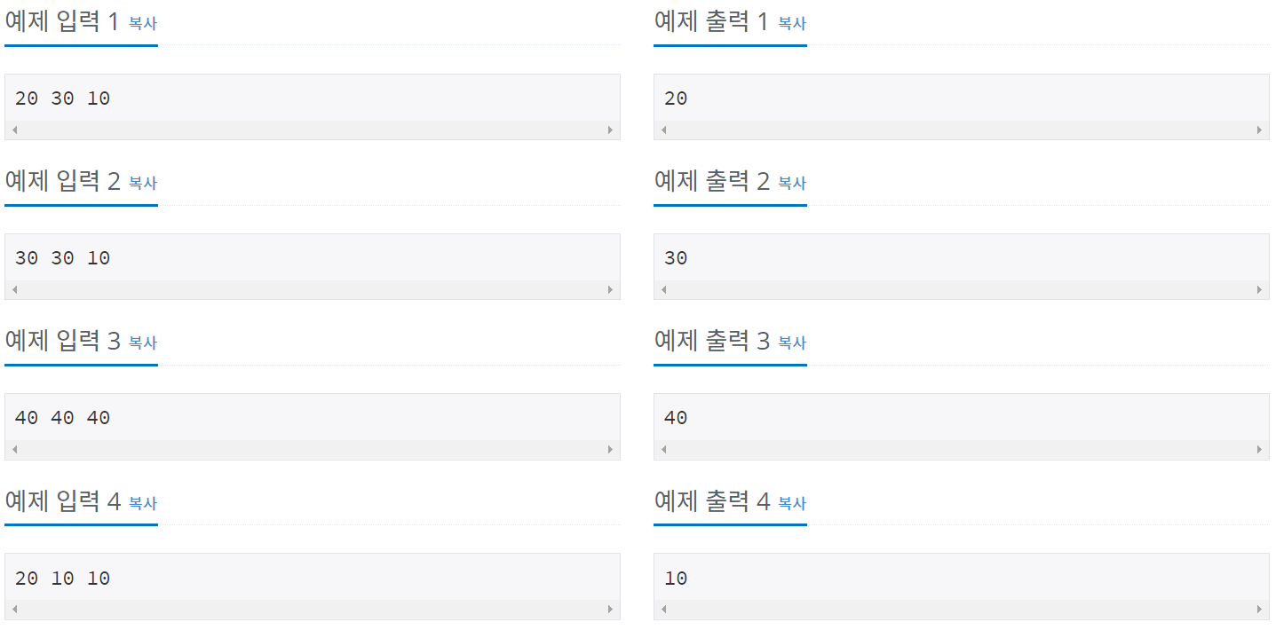 12345678910111213141516171819202122import java.util.Arrays;import java.util.Scanner;public class Main {public static void main(String[] args) {Scanner scan = new Scanner(System.in);int []number = {0,0,0};for(int i=0; i<3; i++) {int num = scan.nextInt();number[i] = num;}Arrays.sort(number);System.out.println(number[1]);}}cs - 결과