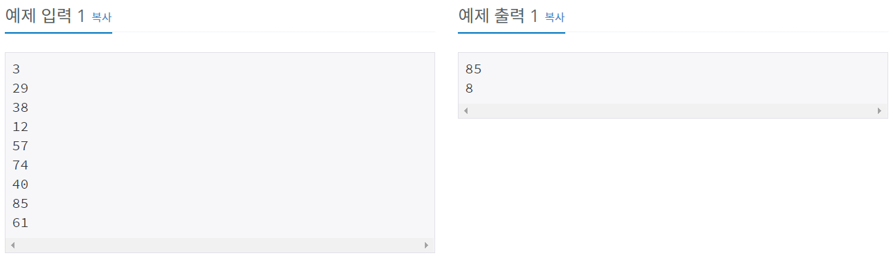 이 주어지면, 이들 중 최댓값은 85이고, 이 값은 8번째 수이다.