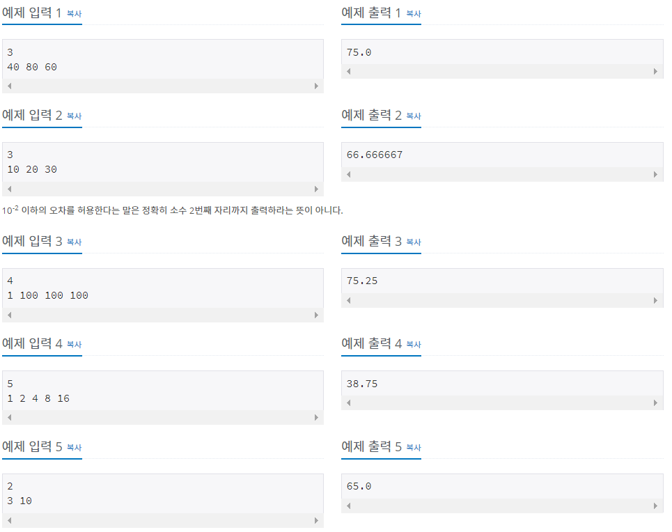 세준이는 기말고사를 망쳤다. 세준이는 점수를 조작해서 집에 가져가기로 했다. 일단 세준이는 자기 점수 중에 최댓값을 골랐다. 이 값을 M이라고 한다. 그리고 나서 모든 점수를 점수/M*100으로 고쳤다.