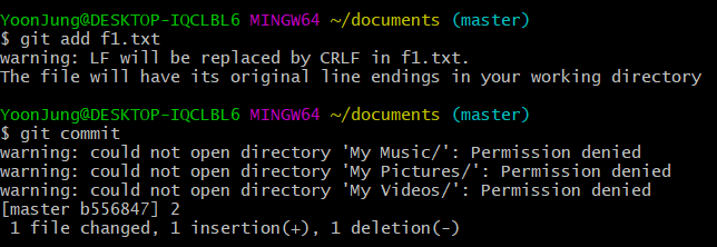 git add f1.txt: 최초로 추적할 때도 사용하고 파일이 수정이 끝나고 버전을 생성할때도 사용