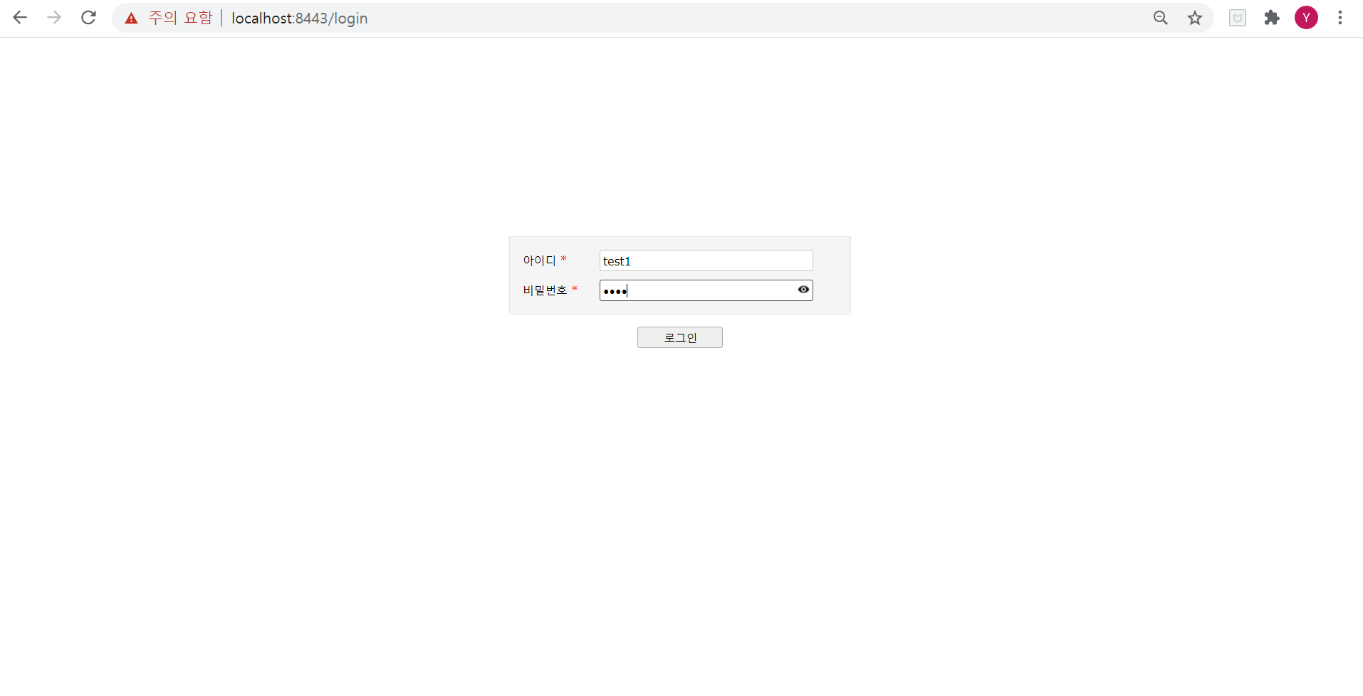 12345678910111213141516171819202122232425262728293031323334353637383940414243444546474849505152535455565758596061<%@ page language="java" contentType="text/html; charset=UTF-8" pageEncoding="UTF-8"%><!DOCTYPE html><html><head><title>Insert title here</title><link rel="stylesheet" href="/resources/lib/jqWidgets/styles/jqx.base.css" type="text/css" /><script type="text/javascript" src="/resources/lib/jquery/jquery-3.4.1.min.js"></script><script type="text/javascript" src="/resources/lib/jqWidgets/jqx-all.js"></script><style>body {width: 100%;height: 600px;background: #fff;margin: 0 auto;display: table;}#loginContent {display: table-cell;text-align: center;vertical-align: middle;}#loginForm {width: 400px;display: inline-block;}</style><script type="text/javascript">$(function() {initComponent();});function initComponent() {var template = [{bind:'userId', name:'userId', type:'text', label:'아이디', required:true, labelWidth:'80px', width:'250px', height: '25px'}, {bind:'passwd', name: 'passwd', type:'password', label:'비밀번호', required:true, labelWidth:'80px', width:'250px'}];$('#loginForm').jqxForm({template: template,padding: { left: 10, top: 10, right: 10, bottom: 10 }});$("#loginBtn").jqxButton({ width: '100', height: '25', value:'로그인'});$("#loginBtn").on('click', function() {$('#loginForm').jqxForm('submit', "/login", null, 'POST');});}</script></head><body><div id="loginContent"><div id="loginForm"></div><div style="width: 100%; text-align: center;"><div style="display: inline-block; text-align: center; margin-top:10px;"><input type="button" id="loginBtn" /></div></div></div></body></html>cs