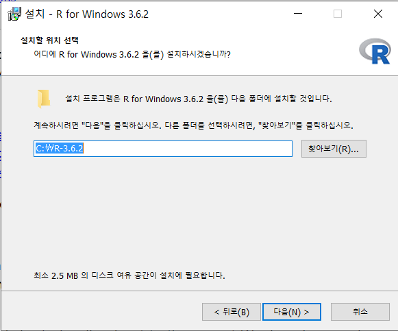 설치할 위치에서 기본으로 program files안에 넣으라도 되어있는데 다른 위치로 변경 (폴더 이름에 띄어쓰기가 있으면 오류 날 확률이 있음) 윈도우키를 누르면 R 실행파일이 뜸