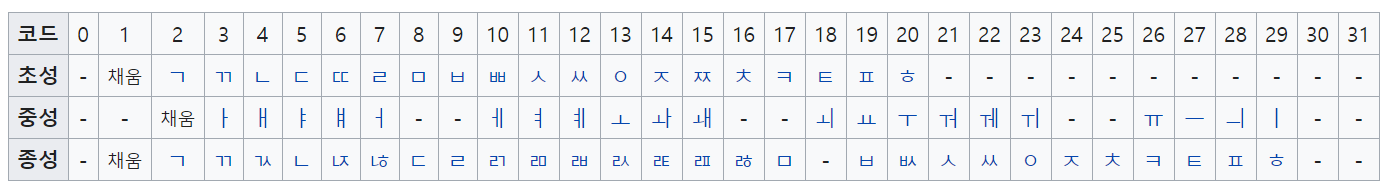 "한글 조합형 인코딩", 위키피디아, https://ko.wikipedia.org/wiki/%ED%95%9C%EA%B8%80_%EC%A1%B0%ED%95%A9%ED%98%95_%EC%9D%B8%EC%BD%94%EB%94%A9