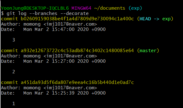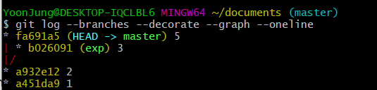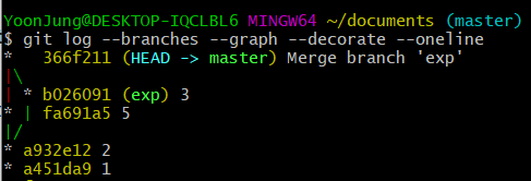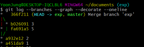 (HEAD -> exp)라고 적힌 것은 exp 브랜치의 가장 최근 commit, HEAD는 현재 exp 브랜치에 체크아웃되었다란 뜻