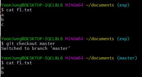 git checkout exp: 현재 쓰고 있는 브랜치를 나가고 exp라는 브랜치를 사용하겠다.