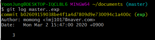 git log master..exp: 버전과 버전 사이의 차이점을 알고 싶을 때, master에는 없고 exp에는 있는 것