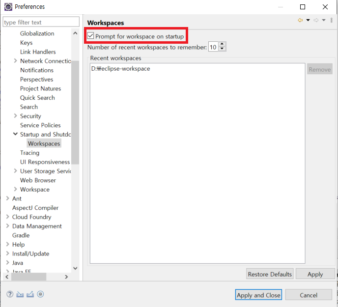 Prompt for workspace on startup 체크하면 워크스페이스 선택 창이 뜨질 않음
