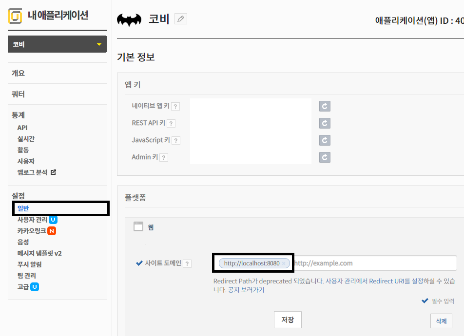 : [웹] 플랫폼을 선택하고, [사이트 도메인] 을 등록합니다. (예: http://localhost:8080)