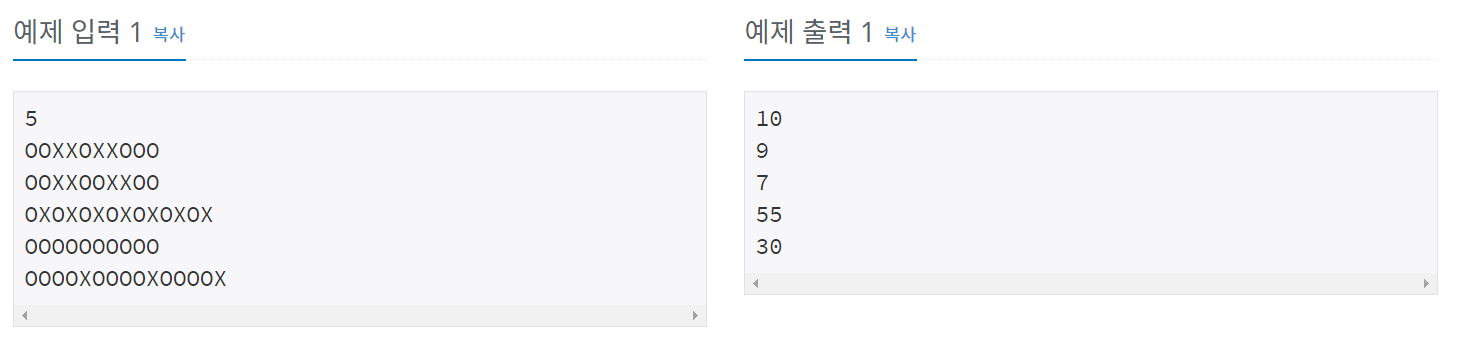 "OOXXOXXOOO"의 점수는 1+2+0+0+1+0+0+1+2+3 = 10점이다.