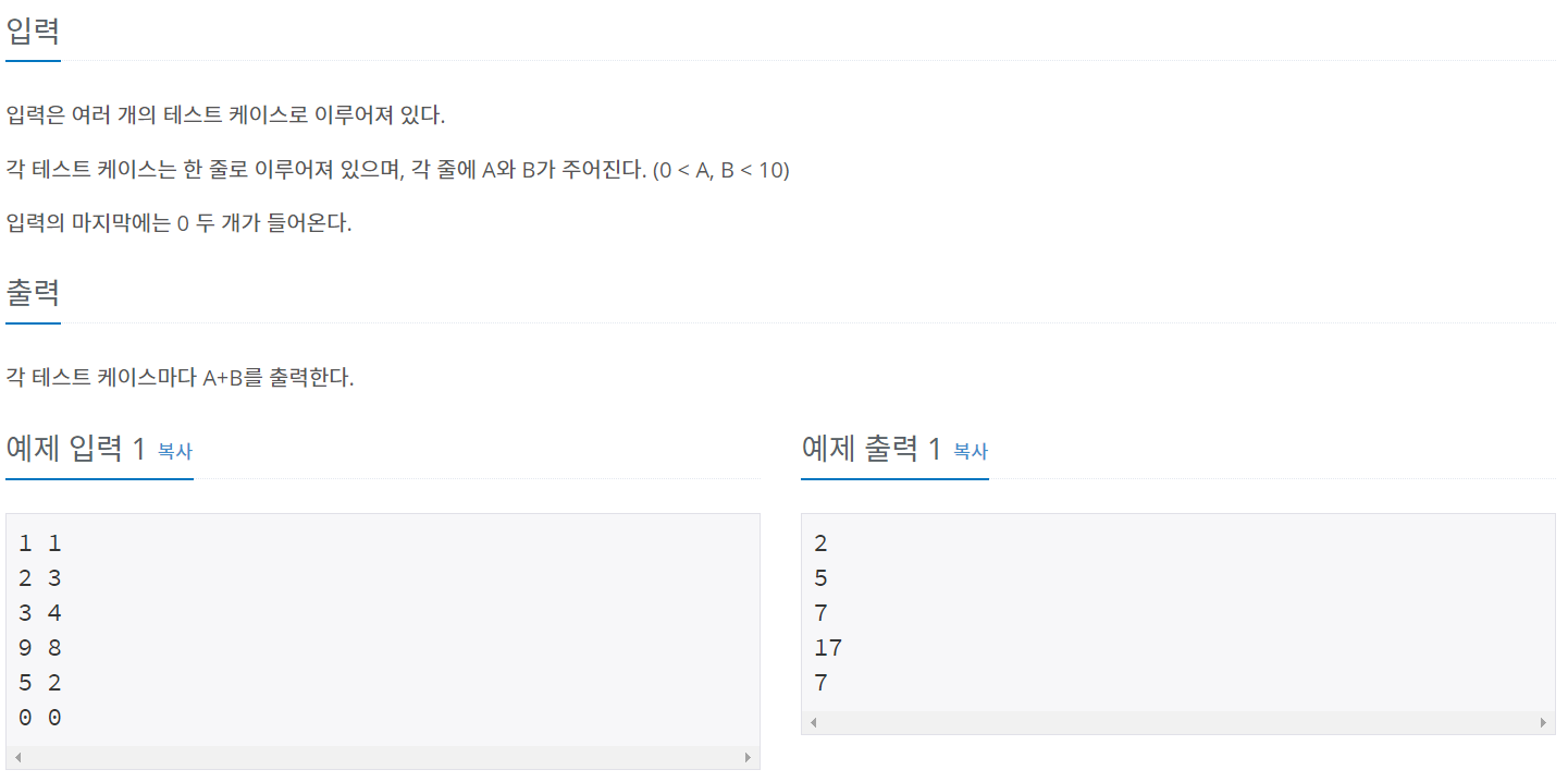 [BaekJoon Java] A+B - 5(10952)Coding Test/BaekJoon 2020. 12. 13. 20:26