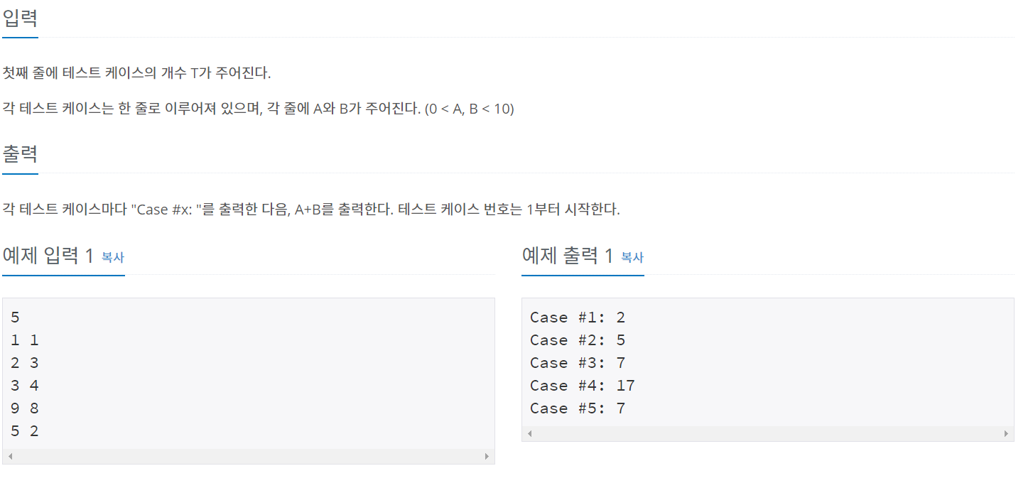 각 테스트 케이스마다 "Case #x: "를 출력한 다음, A+B를 출력한다. 테스트 케이스 번호는 1부터 시작한다.
