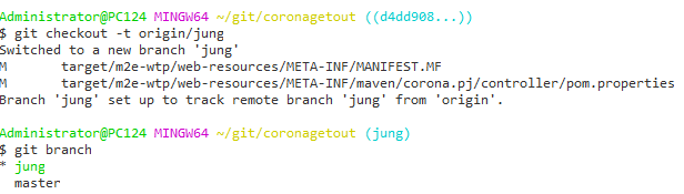 git checkout -t origin/jung 입력하면 원격에 있는 branch 를 가져올 수 있다.