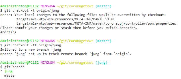 git checkout -tf origin/jung: 원격에 있는 jung 브랜치로 강제로 checkout한다