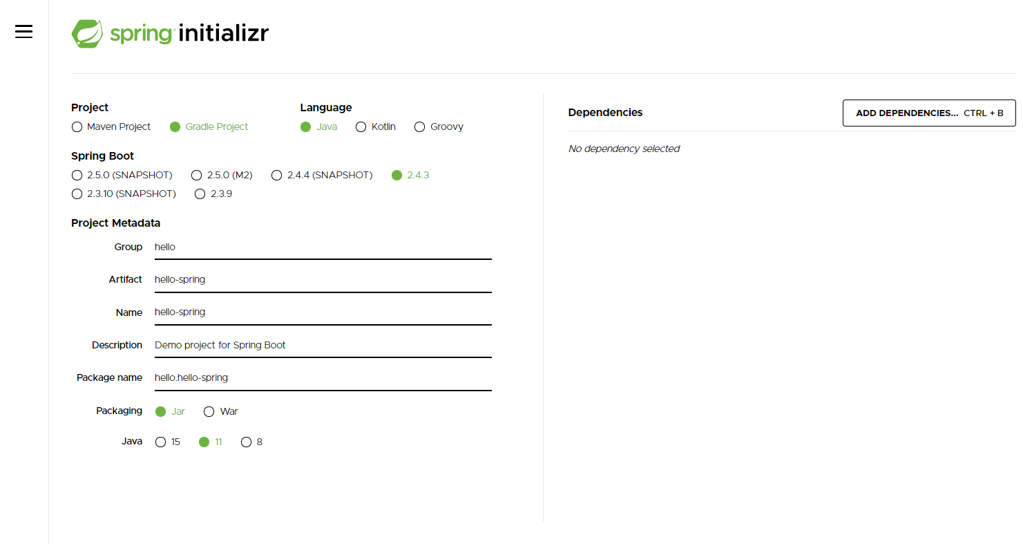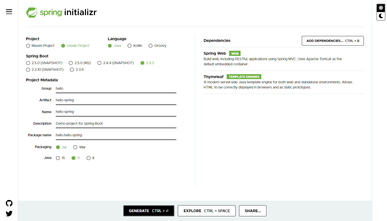 스프링부트 기반으로 프로젝트를 만들어주는 사이트 start.spring.io/