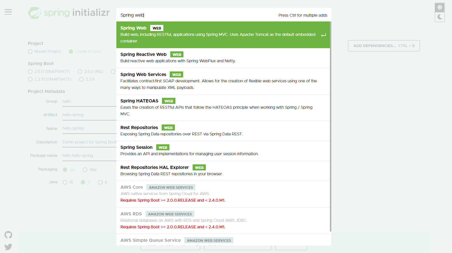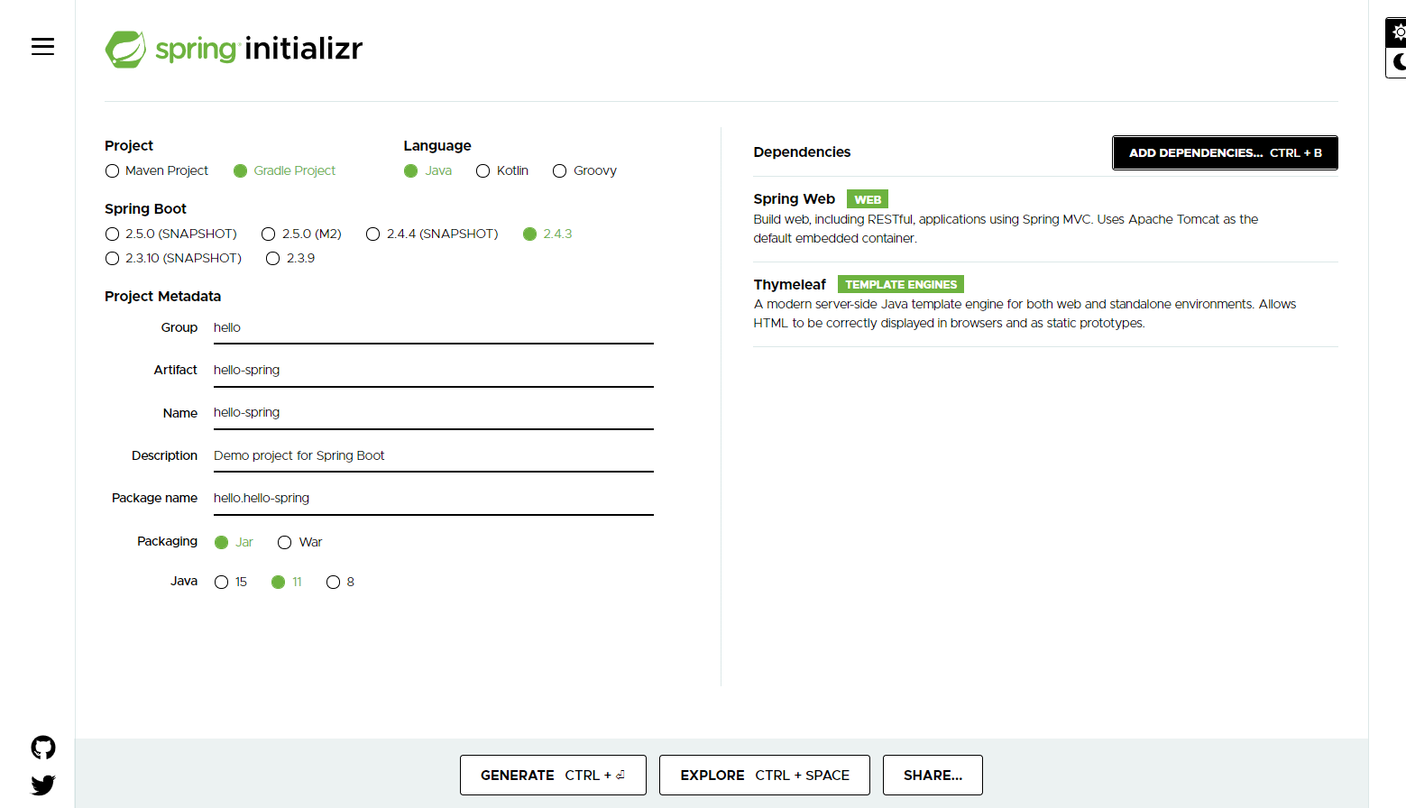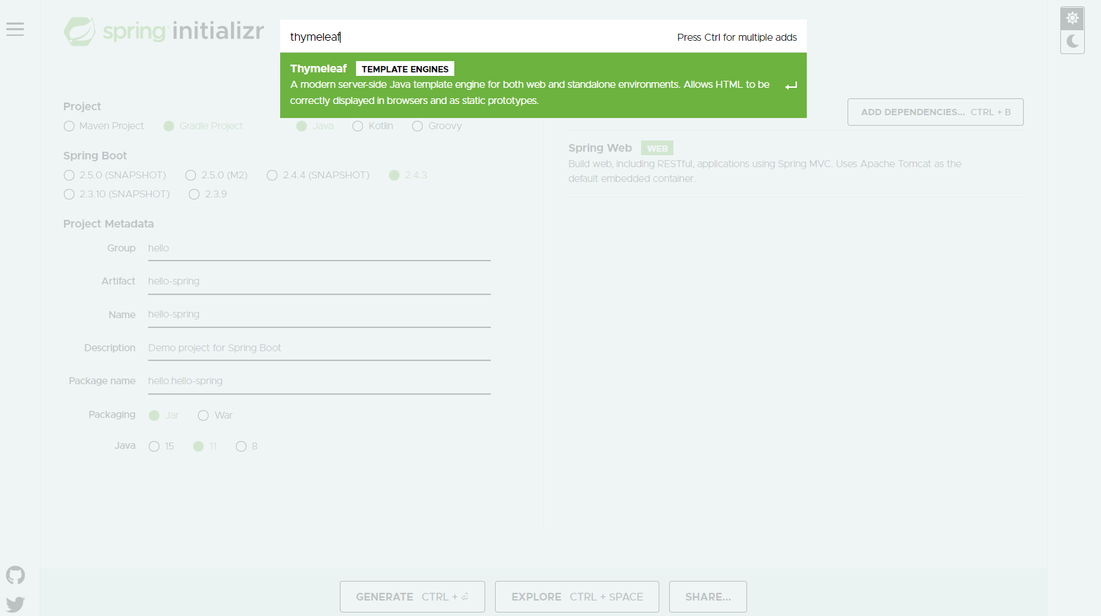 ADD DEPENDENCIDES... 클릭 > Spring Web, Thymeleaf 선택
