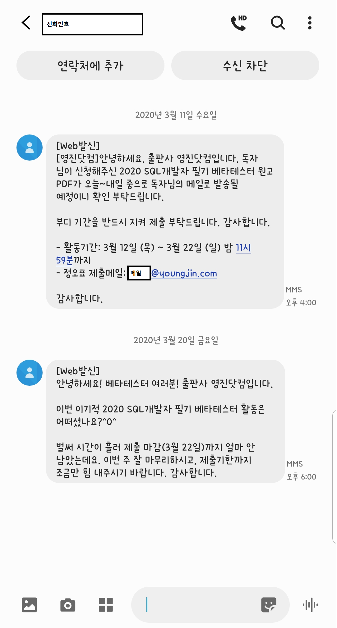 - 안녕하세요. 영진닷컴입니다. 귀하를 2020 SQL 개발자 필기 베타테스터로 모시게 되어 영광입니다. - 이번 베타테스터 활동은 신청하면 100% 참여가 가능한 활동이므로, 신중한 결정 부탁드립니다. 신청 시, 귀하의 이름 / 연락처 / 전자메일주소 / 영진닷컴 쇼핑몰 ID/ sns계정을 요청하고 있습니다. 이는 <2020 SQL 개발자 필기 베타테스터 모집> 외에 어떠한 목적으로 사용되지 않는 점 참고바랍니다. ※신청서 작성 전 활동 혜택 중 하나인