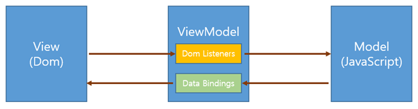 ViewModel: 뷰와 모델의 중간영역. 돔 리스너와 데이터 바인딩을 제공하는 영역