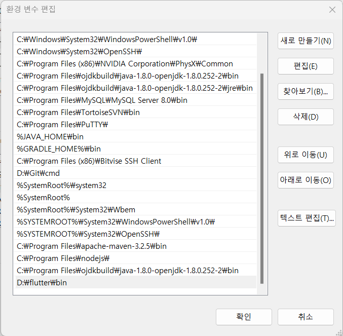 시스템 변수 안에 있는 Path를 더블클릭 한 뒤 flutter\bin(D:\\flutter\\bin)위치를 입력하고 확인을 클릭하여 저장한다.