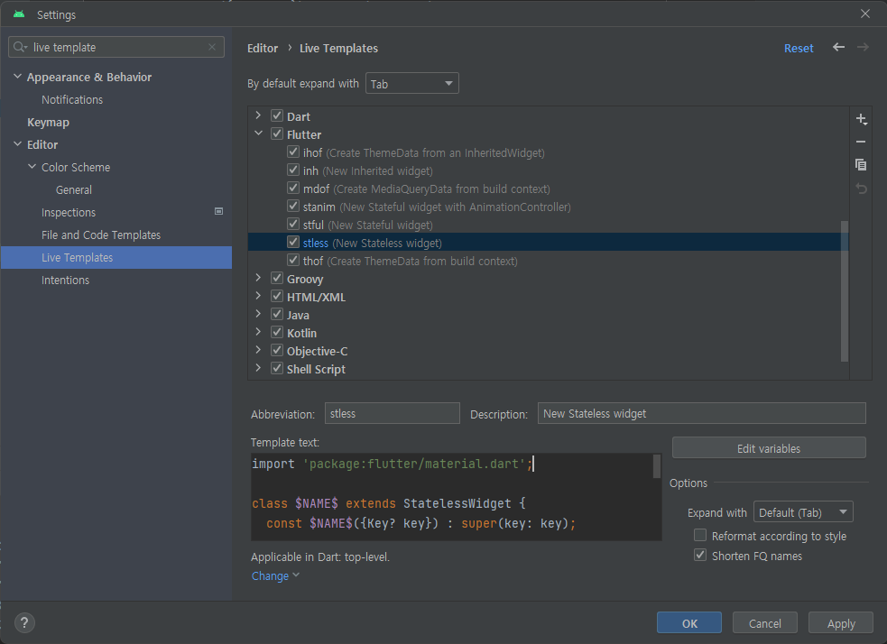 [Flutter] StatelessWidget 자동완성시 import 넣기(stless), 자동완성 코드 구현하기(Live Template)Study/소소한 팁 2023. 5. 15. 15:07