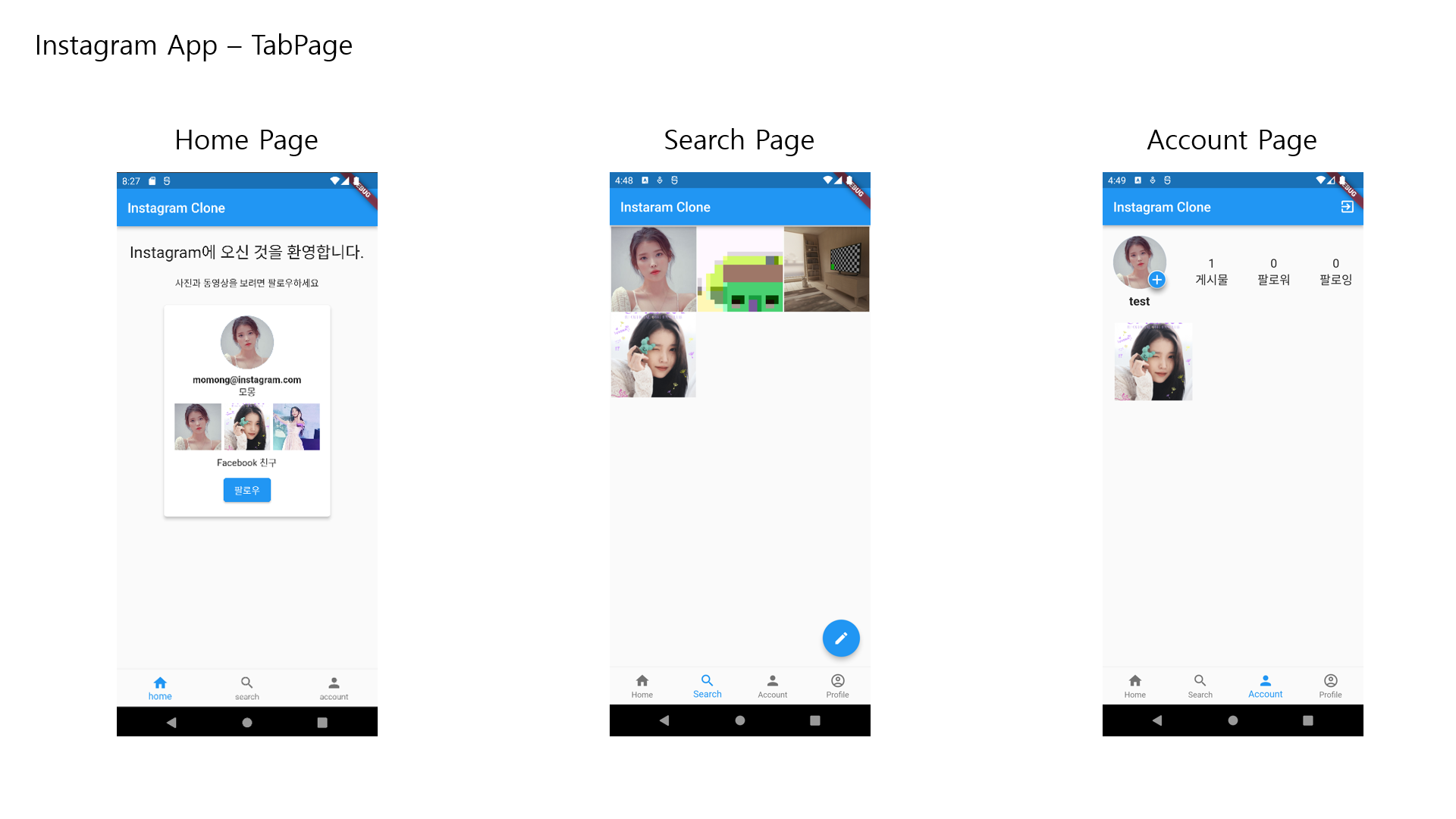 import 'package:flutter/material.dart'; import 'package:instagram_clone/tab/account/account_page.dart'; import 'package:instagram_clone/tab/home/home_page.dart'; import 'package:instagram_clone/tab/search/search_page.dart'; class TabPage extends StatefulWidget { const TabPage({Key? key}) : super(key: key); @override State<TabPage> createState() => _TabPageState(); } class _TabPageState extends State<TabPage> { int _currentIndex = 0; final _pages = const [ HomePage(), SearchPage(), AccountPage(), ]; @override Widget build(BuildContext context) { return Scaffold( body: _pages[_currentIndex], bottomNavigationBar: BottomNavigationBar( currentIndex: _currentIndex, onTap: (index) { setState(() { _currentIndex = index; }); }, items: const [ BottomNavigationBarItem( icon: Icon(Icons.home), label: 'home', ),BottomNavigationBarItem( icon: Icon(Icons.search), label: 'search', ),BottomNavigationBarItem( icon: Icon(Icons.person), label: 'account', ), ], ), ); } }네비게이션바 아이템을 클릭시 body 내용이 변할 수 있도록, 네비바 아이템과 body안 페이지 리스트 갯수를 맞춰 코드를 설계한다.