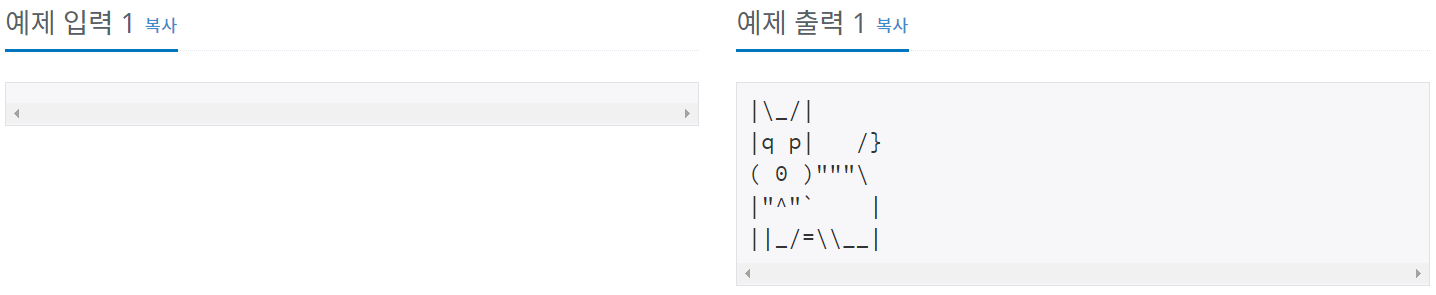 문제 아래 예제와 같이 개를 출력하시오. 입력 출력 예제 입력 1 복사 예제 출력 1 복사 |\_/| |q p| /} ( 0 )"""\ |"^"` | ||_/=\\__|...
