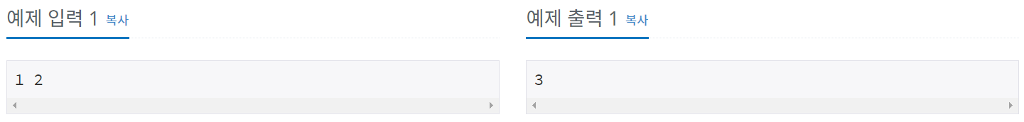 문제 두 정수 A와 B를 입력받은 다음, A+B를 출력하는 프로그램을 작성하시오. 입력 첫째 줄에 A와 B가 주어진다. (0 < A, B < 10) 출력 첫째 줄에 A+B를 출력한다. 예제 입력 1 복사 1 2 예제 출력 1 복사
